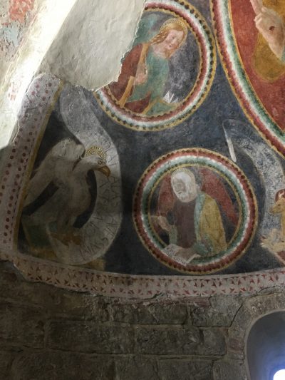 La chiesa è orientata a ovest, da cui si entra, secondo i dettami dell’epoca in cui fu costruita. L’ovest era infatti il buio, la morte, e i fedeli entravano dal lato del buio e guardavano verso l’altare, orientato a Est, vedevano la luce e la vita eterna… Dalle strette monofore poste nell’abside entrava una luce che illuminava direttamente l’altare e il Cristo Pantocratore, segno che la luce era Dio. All’esterno della chiesa è possibile vedere la decorazione con sole e luna della monofora su cui entrava la prima luce del mattino.