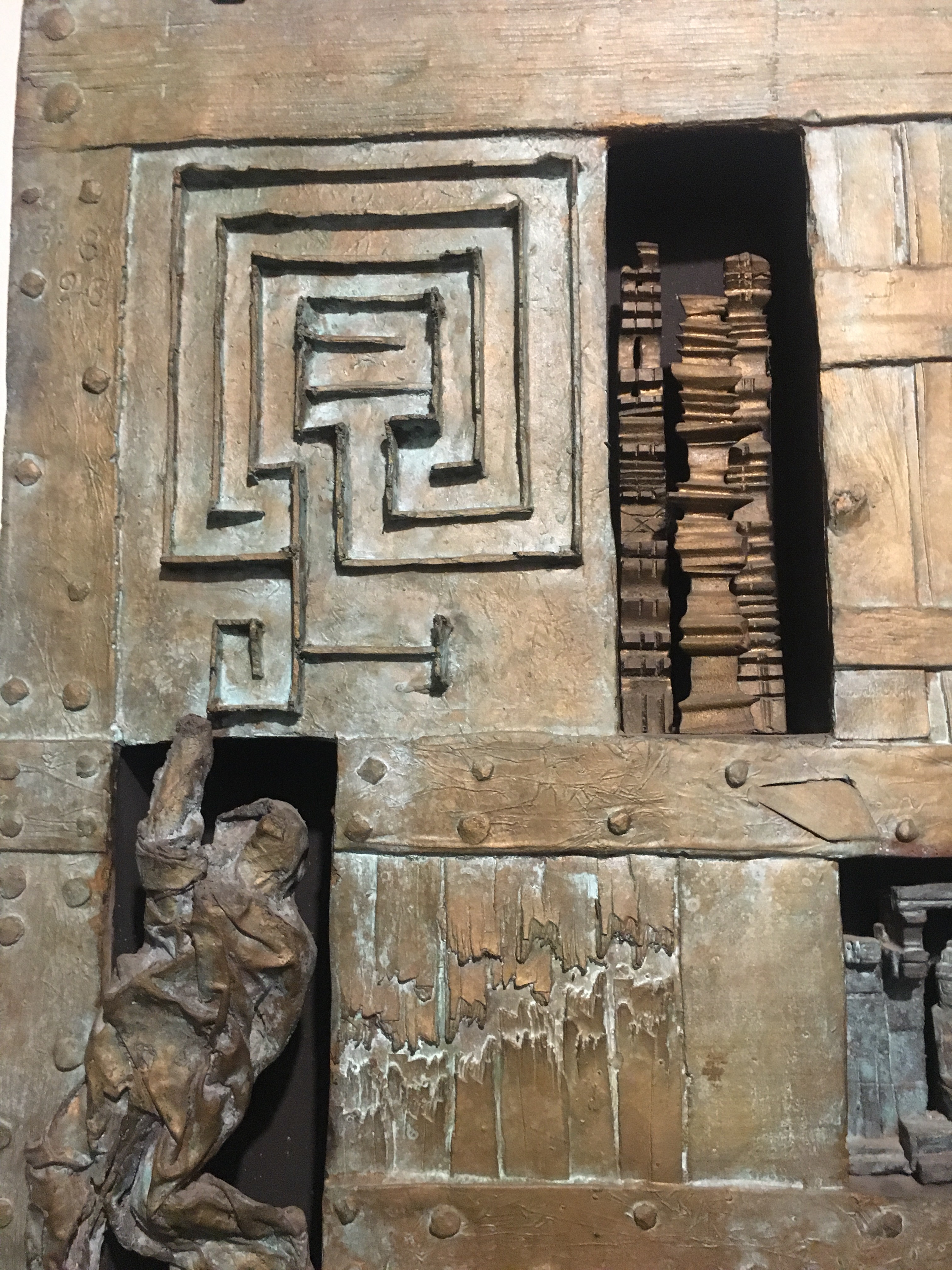 Alle pareti erano presenti delle porte realizzate in bronzo, scolpite e finemente cesellate. E se fino a pochi minuti prima stavamo contemplando frammenti di affresco di una facciata parlante cinquecentesca, eccoci ora ad ammirare le porte parlanti di Angelini. Non so niente di quelle porte: non so cosa fossero, perché e per cosa le avesse realizzate. So solo che ogni pezzo di quelle porte raccontavano una storia fatta di uomini, di lavoro, di arti e mestieri. E mi sono piaciute moltissimo.